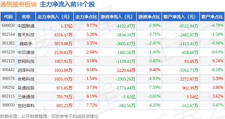 从资金流向上来看,当日通信服务板块主力资金净流出4.89亿元,游资资金净流出1.76亿元,散户资金净流入6.66亿元。通信服务板块个股资金流向见下表: