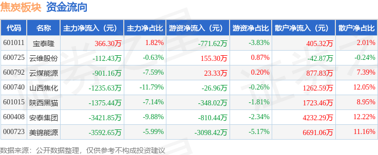 从资金流向上来看,当日焦炭板块主力资金净流出1.03亿元,游资资金净流出4876.82万元,散户资金净流入1.51亿元。焦炭板块个股资金流向见下表: