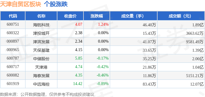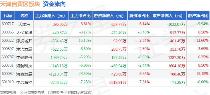 从资金流向上来看,当日天津自贸区板块主力资金净流出1.34亿元,游资资金净流入9118.47万元,散户资金净流入4295.39万元。天津自贸区板块个股资金流向见下表: