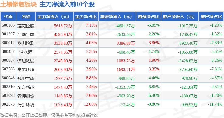 从资金流向上来看,当日土壤修复板块主力资金净流出6.6亿元,游资资金净流入1.02亿元,散户资金净流入5.57亿元。土壤修复板块个股资金流向见下表: