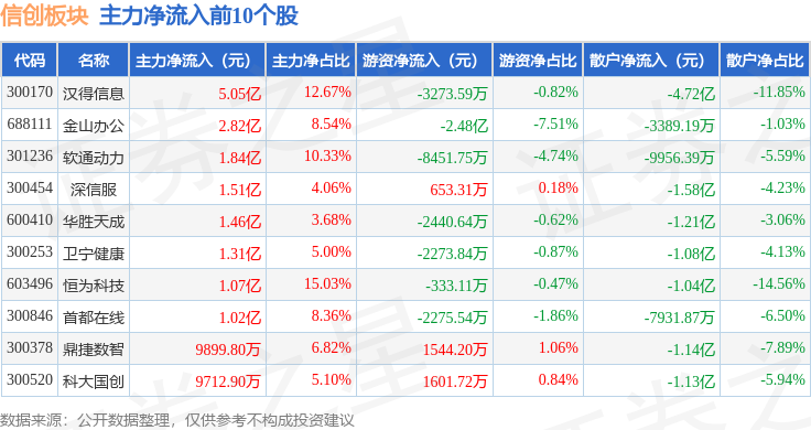 从资金流向上来看,当日信创板块主力资金净流出36.92亿元,游资资金净流入8.47亿元,散户资金净流入28.45亿元。信创板块个股资金流向见下表:
