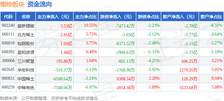 从资金流向上来看,当日镨钕板块主力资金净流入8.27亿元,游资资金净流出2.32亿元,散户资金净流出5.95亿元。镨钕板块个股资金流向见下表: