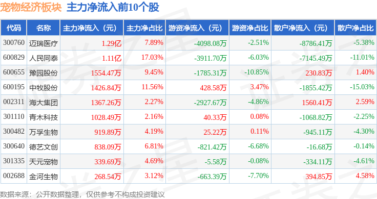 从资金流向上来看,当日宠物经济板块主力资金净流出514.64万元,游资资金净流出5139.26万元,散户资金净流入5653.9万元。宠物经济板块个股资金流向见下表:
