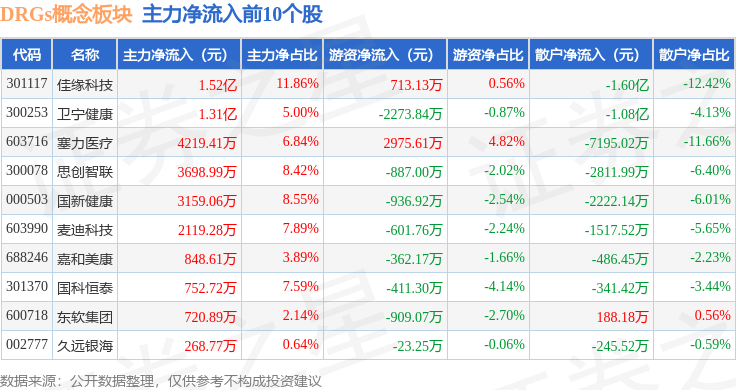 从资金流向上来看,当日DRGs概念板块主力资金净流入2.49亿元,游资资金净流入71.0万元,散户资金净流出2.49亿元。DRGs概念板块个股资金流向见下表: