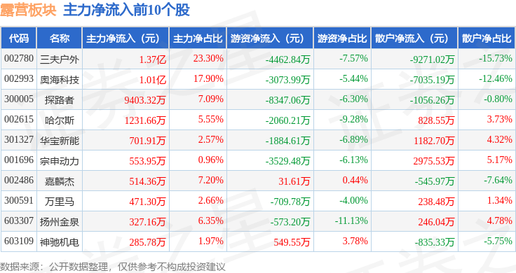 从资金流向上来看,当日露营板块主力资金净流入1841.46万元,游资资金净流出2.15亿元,散户资金净流入1.97亿元。露营板块个股资金流向见下表: