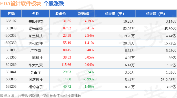 证券之星消息,1月23日EDA设计软件板块较上一交易日上涨1.45%,安路科技领涨。当日上证指数报收于4136.16,上涨0.33%。深证成指报收于14439.66,上涨0.79%。EDA设计软件板块个股涨跌见下表: