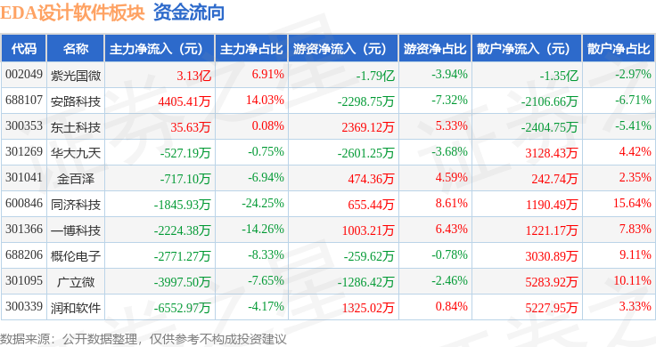 从资金流向上来看,当日EDA设计软件板块主力资金净流入1.71亿元,游资资金净流出1.85亿元,散户资金净流入1359.65万元。EDA设计软件板块个股资金流向见下表:
