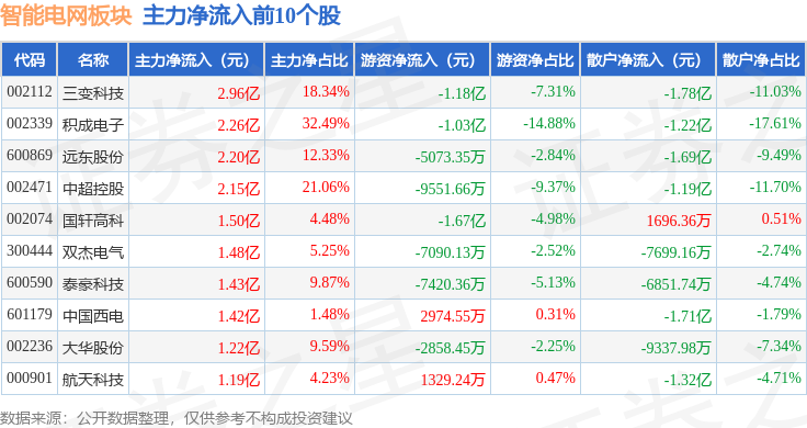 从资金流向上来看,当日智能电网板块主力资金净流出62.75亿元,游资资金净流入13.29亿元,散户资金净流入49.47亿元。智能电网板块个股资金流向见下表: