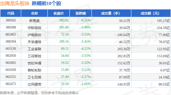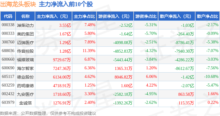 从资金流向上来看,当日出海龙头板块主力资金净流出178.78亿元,游资资金净流入61.94亿元,散户资金净流入116.84亿元。出海龙头板块个股资金流向见下表: