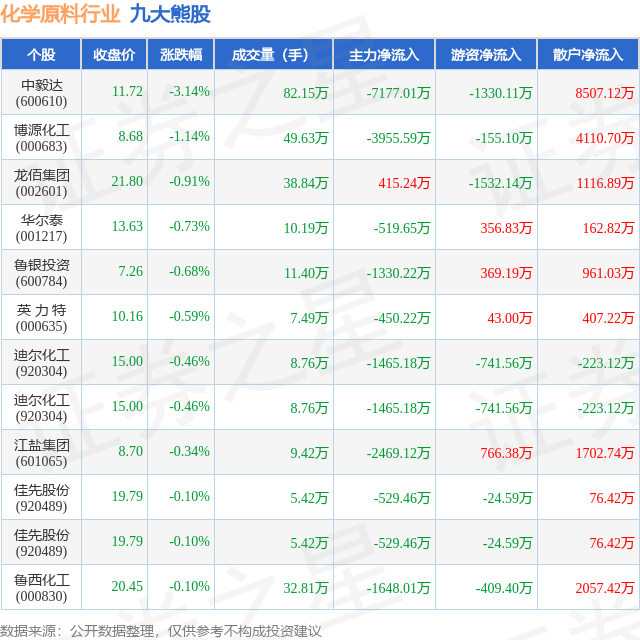 个股表现方面,化学原料行业当日领跌股为中毅达(600610),该股当日报收11.72,下跌3.14%,成交量82.15万,主力资金净流出7177.01万元。博源化工(000683)以下跌1.14%紧随其后,该股当日成交量49.63万,主力资金净流出3955.59万元。除此之外,龙佰集团(002601)、华尔泰(001217)、鲁银投资(600784)均进入当日熊股之列。具体个股列表见下表: