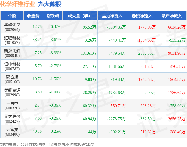 个股表现方面,化学纤维行业当日领跌股为华峰化学(002064),该股当日报收12.78,下跌6.37%,成交量95.52万,主力资金净流出8604.36万元。汇隆新材(301057)以下跌3.61%紧随其后,该股当日成交量3.26万,主力资金净流出449.41万元。除此之外,新乡化纤(000949)、恒申新材(000782)、聚合顺(605166)均进入当日熊股之列。具体个股列表见下表:
