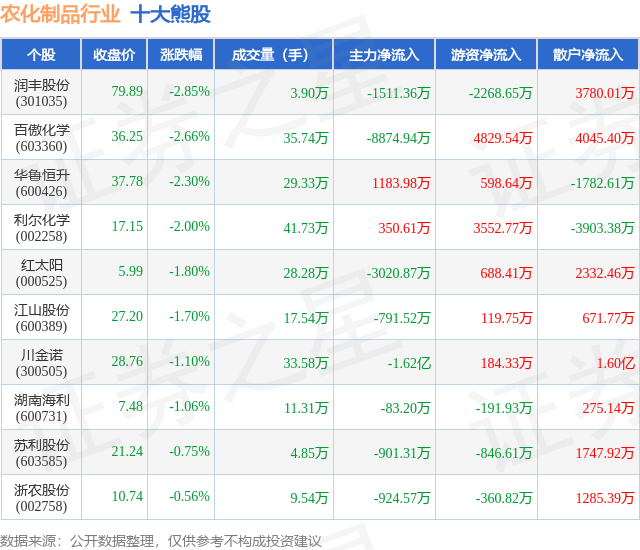 个股表现方面,农化制品行业当日领跌股为润丰股份(301035),该股当日报收79.89,下跌2.85%,成交量3.9万,主力资金净流出1511.36万元。百傲化学(603360)以下跌2.66%紧随其后,该股当日成交量35.74万,主力资金净流出8874.94万元。除此之外,华鲁恒升(600426)、利尔化学(002258)、红太阳(000525)均进入当日熊股之列。具体个股列表见下表: