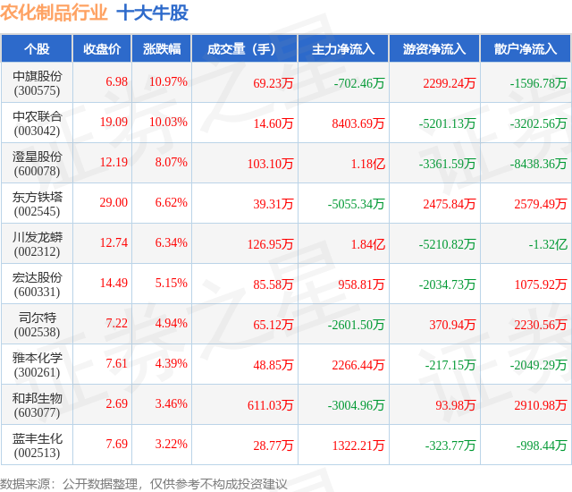 个股表现方面,农化制品行业当日领涨股为中旗股份(300575),该股当日报收6.98,上涨10.97%,成交量69.23万,主力资金净流出702.46万元。中农联合(003042)以上涨10.03%紧随其后,该股当日成交量14.6万,主力资金净流入8403.69万元。除此之外,澄星股份(600078)、东方铁塔(002545)、川发龙蟒(002312)均进入当日牛股之列。具体个股列表见下表: