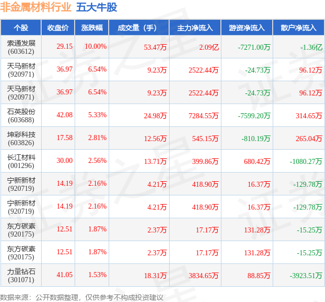 个股表现方面,非金属材料行业当日领涨股为索通发展(603612),该股当日报收29.15,上涨10.0%,成交量53.47万,主力资金净流入2.09亿元。天马新材(920971)以上涨6.54%紧随其后,该股当日成交量9.23万,主力资金净流入2522.44万元。除此之外,天马新材(920971)、石英股份(603688)、坤彩科技(603826)均进入当日牛股之列。具体个股列表见下表:
