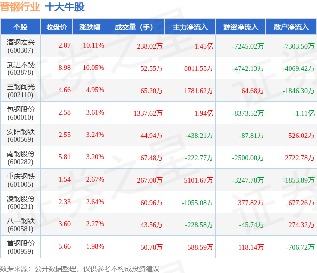 个股表现方面,普钢行业当日领涨股为酒钢宏兴(600307),该股当日报收2.07,上涨10.11%,成交量238.02万,主力资金净流入1.45亿元。武进不锈(603878)以上涨10.05%紧随其后,该股当日成交量52.55万,主力资金净流入8811.55万元。除此之外,三钢闽光(002110)、包钢股份(600010)、安阳钢铁(600569)均进入当日牛股之列。具体个股列表见下表: