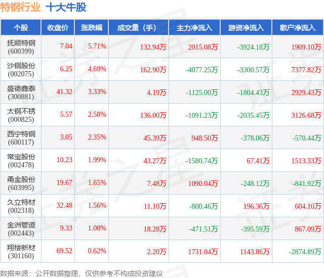 个股表现方面,特钢行业当日领涨股为抚顺特钢(600399),该股当日报收7.04,上涨5.71%,成交量132.94万,主力资金净流入2015.08万元。沙钢股份(002075)以上涨4.69%紧随其后,该股当日成交量162.9万,主力资金净流出4077.25万元。除此之外,盛德鑫泰(300881)、太钢不锈(000825)、西宁特钢(600117)均进入当日牛股之列。具体个股列表见下表: