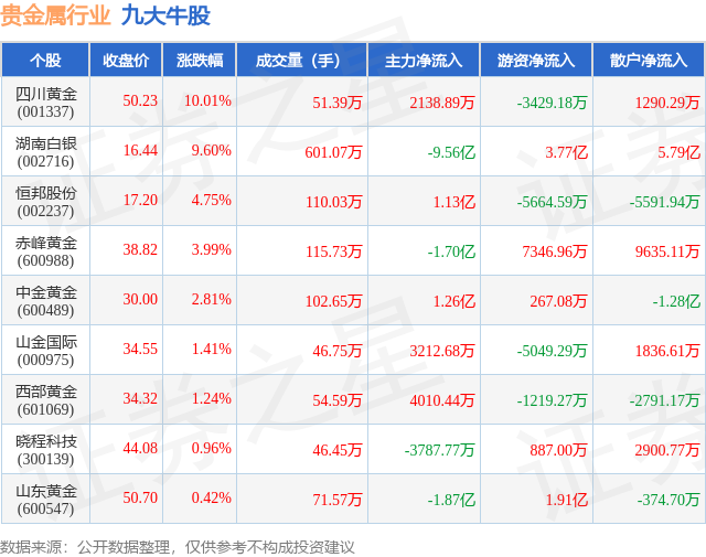 个股表现方面,贵金属行业当日领涨股为四川黄金(001337),该股当日报收50.23,上涨10.01%,成交量51.39万,主力资金净流入2138.89万元。湖南白银(002716)以上涨9.6%紧随其后,该股当日成交量601.07万,主力资金净流出9.56亿元。除此之外,恒邦股份(002237)、赤峰黄金(600988)、中金黄金(600489)均进入当日牛股之列。具体个股列表见下表: