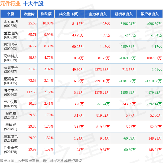 个股表现方面,元件行业当日领涨股为金安国纪(002636),该股当日报收25.63,上涨10.0%,成交量81.12万,主力资金净流入1.23亿元。世运电路(603920)以上涨9.99%紧随其后,该股当日成交量43.29万,主力资金净流入4.39亿元。除此之外,科翔股份(300903)、高华科技(688539)、弘信电子(300657)均进入当日牛股之列。具体个股列表见下表: