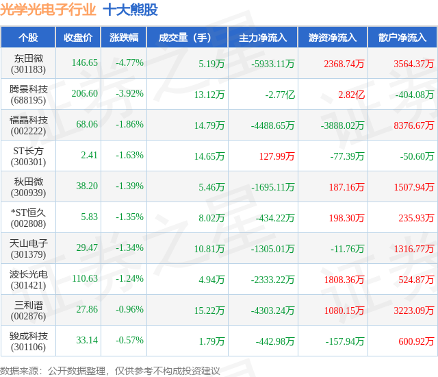 个股表现方面,光学光电子行业当日领跌股为东田微(301183),该股当日报收146.65,下跌4.77%,成交量5.19万,主力资金净流出5933.11万元。腾景科技(688195)以下跌3.92%紧随其后,该股当日成交量13.12万,主力资金净流出2.77亿元。除此之外,福晶科技(002222)、ST长方(300301)、秋田微(300939)均进入当日熊股之列。具体个股列表见下表: