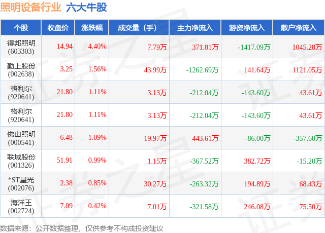 个股表现方面,照明设备行业当日领涨股为得邦照明(603303),该股当日报收14.94,上涨4.4%,成交量7.79万,主力资金净流入371.81万元。勤上股份(002638)以上涨1.56%紧随其后,该股当日成交量43.99万,主力资金净流出1262.69万元。除此之外,格利尔(920641)、格利尔(920641)、佛山照明(000541)均进入当日牛股之列。具体个股列表见下表: