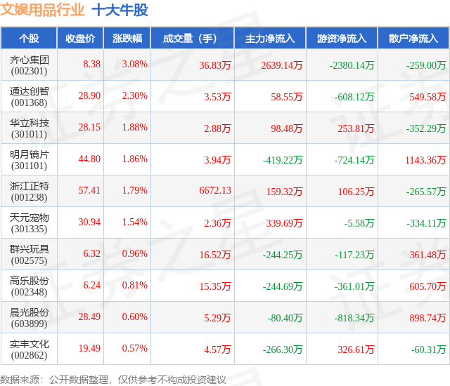 个股表现方面,文娱用品行业当日领涨股为齐心集团(002301),该股当日报收8.38,上涨3.08%,成交量36.83万,主力资金净流入2639.14万元。通达创智(001368)以上涨2.3%紧随其后,该股当日成交量3.53万,主力资金净流入58.55万元。除此之外,华立科技(301011)、明月镜片(301101)、浙江正特(001238)均进入当日牛股之列。具体个股列表见下表: