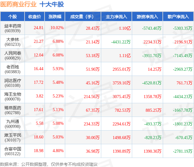 个股表现方面,医药商业行业当日领涨股为益丰药房(603939),该股当日报收24.81,上涨10.02%,成交量28.43万,主力资金净流入1.1亿元。大参林(603233)以上涨6.88%紧随其后,该股当日成交量21.14万,主力资金净流出4431.22万元。除此之外,人民同泰(600829)、老百姓(603883)、润达医疗(603108)均进入当日牛股之列。具体个股列表见下表: