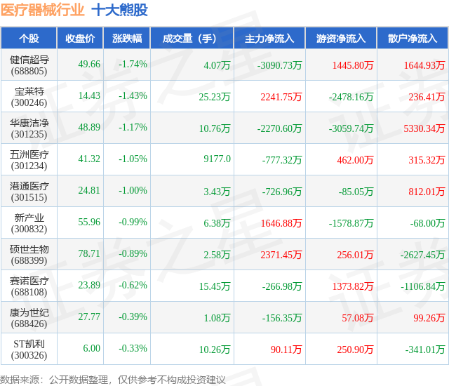 个股表现方面,医疗器械行业当日领跌股为健信超导(688805),该股当日报收49.66,下跌1.74%,成交量4.07万,主力资金净流出3090.73万元。宝莱特(300246)以下跌1.43%紧随其后,该股当日成交量25.23万,主力资金净流入2241.75万元。除此之外,华康洁净(301235)、五洲医疗(301234)、港通医疗(301515)均进入当日熊股之列。具体个股列表见下表: