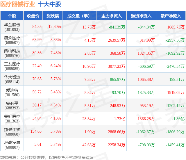 个股表现方面,医疗器械行业当日领涨股为华兰股份(301093),该股当日报收84.35,上涨12.8%,成交量13.75万,主力资金净流出841.39万元。康众医疗(688607)以上涨8.33%紧随其后,该股当日成交量4.15万,主力资金净流入2639.57万元。除此之外,西山科技(688576)、三友医疗(688085)、华大智造(688114)均进入当日牛股之列。具体个股列表见下表: