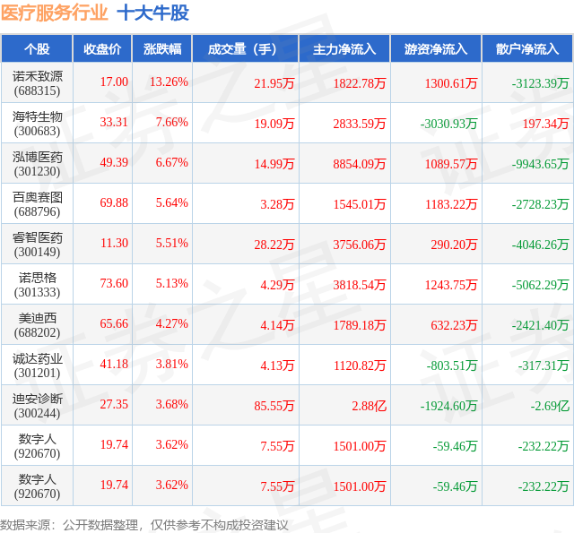 个股表现方面,医疗服务行业当日领涨股为诺禾致源(688315),该股当日报收17.0,上涨13.26%,成交量21.95万,主力资金净流入1822.78万元。海特生物(300683)以上涨7.66%紧随其后,该股当日成交量19.09万,主力资金净流入2833.59万元。除此之外,泓博医药(301230)、百奥赛图(688796)、睿智医药(300149)均进入当日牛股之列。具体个股列表见下表: