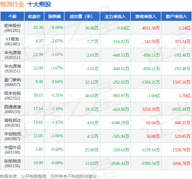 个股表现方面,物流行业当日领跌股为炬申股份(001202),该股当日报收20.3,下跌8.6%,成交量36.06万,主力资金净流出1.64亿元。ST雪发(002485)以下跌2.67%紧随其后,该股当日成交量7.77万,主力资金净流出516.92万元。除此之外,华光源海(920351)、华光源海(920351)、厦门象屿(600057)均进入当日熊股之列。具体个股列表见下表: