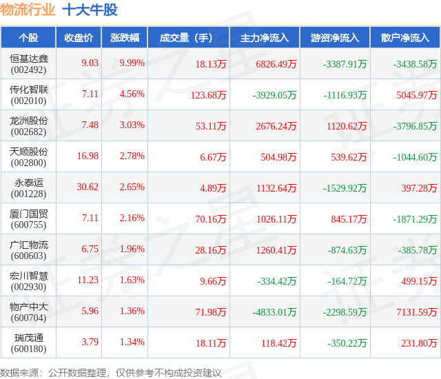 个股表现方面,物流行业当日领涨股为恒基达鑫(002492),该股当日报收9.03,上涨9.99%,成交量18.13万,主力资金净流入6826.49万元。传化智联(002010)以上涨4.56%紧随其后,该股当日成交量123.68万,主力资金净流出3929.05万元。除此之外,龙洲股份(002682)、天顺股份(002800)、永泰运(001228)均进入当日牛股之列。具体个股列表见下表: