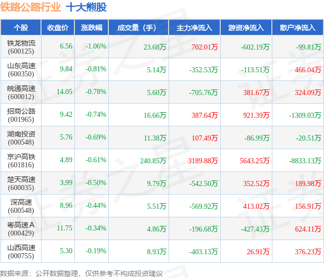 个股表现方面,铁路公路行业当日领跌股为铁龙物流(600125),该股当日报收6.56,下跌1.06%,成交量23.68万,主力资金净流入702.01万元。山东高速(600350)以下跌0.81%紧随其后,该股当日成交量5.14万,主力资金净流出352.53万元。除此之外,皖通高速(600012)、招商公路(001965)、湖南投资(000548)均进入当日熊股之列。具体个股列表见下表: