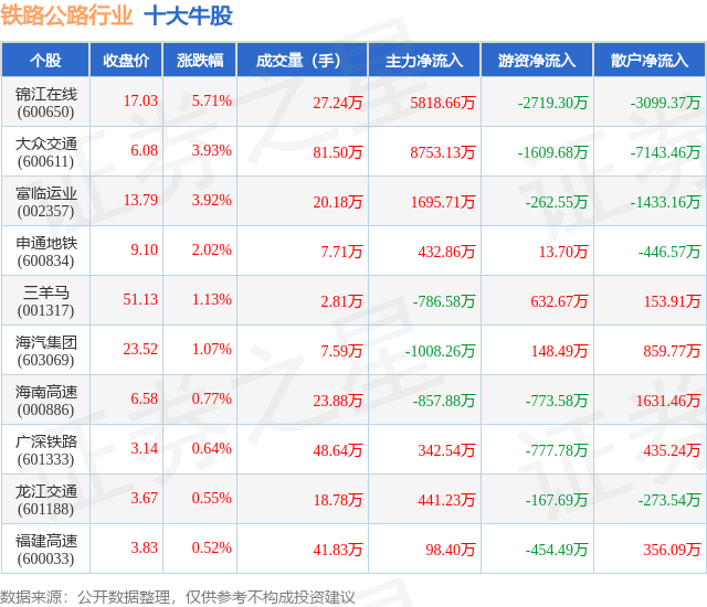 个股表现方面,铁路公路行业当日领涨股为锦江在线(600650),该股当日报收17.03,上涨5.71%,成交量27.24万,主力资金净流入5818.66万元。大众交通(600611)以上涨3.93%紧随其后,该股当日成交量81.5万,主力资金净流入8753.13万元。除此之外,富临运业(002357)、申通地铁(600834)、三羊马(001317)均进入当日牛股之列。具体个股列表见下表:
