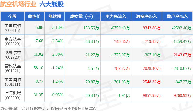 个股表现方面,航空机场行业当日领跌股为中国东航(600115),该股当日报收5.88,下跌3.13%,成交量153.56万,主力资金净流出6750.4万元。南方航空(600029)以下跌2.54%紧随其后,该股当日成交量58.43万,主力资金净流入740.36万元。除此之外,华夏航空(002928)、春秋航空(601021)、中国国航(601111)均进入当日熊股之列。具体个股列表见下表: