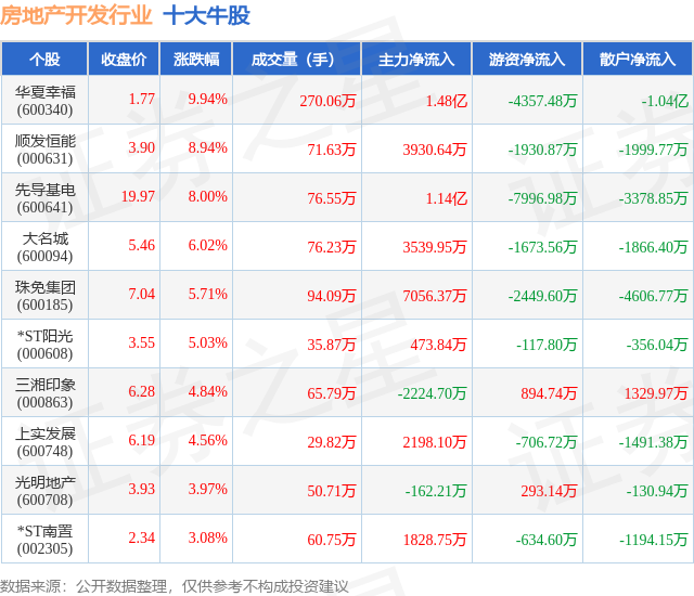个股表现方面,房地产开发行业当日领涨股为华夏幸福(600340),该股当日报收1.77,上涨9.94%,成交量270.06万,主力资金净流入1.48亿元。顺发恒能(000631)以上涨8.94%紧随其后,该股当日成交量71.63万,主力资金净流入3930.64万元。除此之外,先导基电(600641)、大名城(600094)、珠免集团(600185)均进入当日牛股之列。具体个股列表见下表: