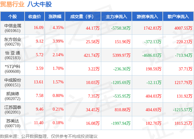个股表现方面,贸易行业当日领涨股为中信金属(601061),该股当日报收16.09,上涨4.35%,成交量44.17万,主力资金净流出5750.38万元。东方创业(600278)以上涨3.99%紧随其后,该股当日成交量25.58万,主力资金净流入151.9万元。除此之外,怡 亚 通(002183)、*ST沪科(600608)、中成股份(000151)均进入当日牛股之列。具体个股列表见下表: