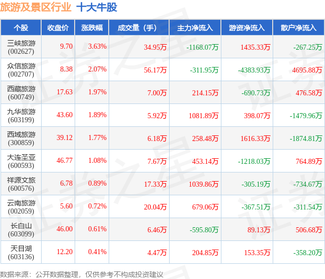 个股表现方面,旅游及景区行业当日领涨股为三峡旅游(002627),该股当日报收9.7,上涨3.63%,成交量34.95万,主力资金净流出1168.07万元。众信旅游(002707)以上涨2.07%紧随其后,该股当日成交量56.17万,主力资金净流出311.95万元。除此之外,西藏旅游(600749)、九华旅游(603199)、西域旅游(300859)均进入当日牛股之列。具体个股列表见下表: