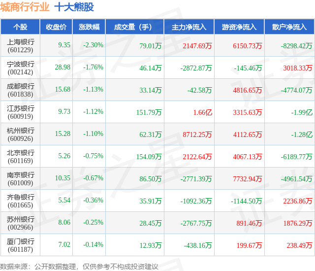个股表现方面,城商行行业当日领跌股为上海银行(601229),该股当日报收9.35,下跌2.3%,成交量79.01万,主力资金净流入2147.69万元。宁波银行(002142)以下跌1.76%紧随其后,该股当日成交量46.14万,主力资金净流出2872.87万元。除此之外,成都银行(601838)、江苏银行(600919)、杭州银行(600926)均进入当日熊股之列。具体个股列表见下表: