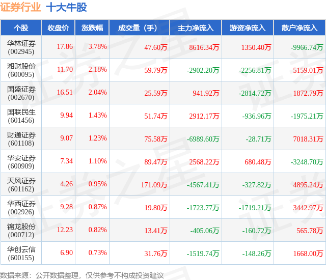 个股表现方面,证券行业当日领涨股为华林证券(002945),该股当日报收17.86,上涨3.78%,成交量47.6万,主力资金净流入8616.34万元。湘财股份(600095)以上涨2.18%紧随其后,该股当日成交量59.79万,主力资金净流出2902.2万元。除此之外,国盛证券(002670)、国联民生(601456)、财通证券(601108)均进入当日牛股之列。具体个股列表见下表: