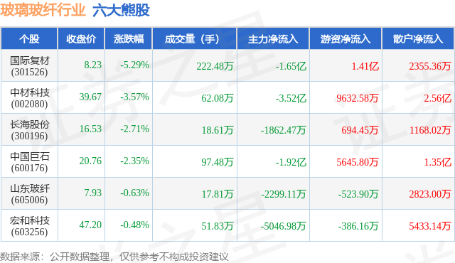 个股表现方面,玻璃玻纤行业当日领跌股为国际复材(301526),该股当日报收8.23,下跌5.29%,成交量222.48万,主力资金净流出1.65亿元。中材科技(002080)以下跌3.57%紧随其后,该股当日成交量62.08万,主力资金净流出3.52亿元。除此之外,长海股份(300196)、中国巨石(600176)、山东玻纤(605006)均进入当日熊股之列。具体个股列表见下表: