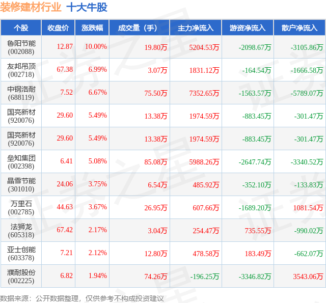 个股表现方面,装修建材行业当日领涨股为鲁阳节能(002088),该股当日报收12.87,上涨10.0%,成交量19.8万,主力资金净流入5204.53万元。友邦吊顶(002718)以上涨6.99%紧随其后,该股当日成交量3.07万,主力资金净流入1831.12万元。除此之外,中钢洛耐(688119)、国亮新材(920076)、国亮新材(920076)均进入当日牛股之列。具体个股列表见下表: