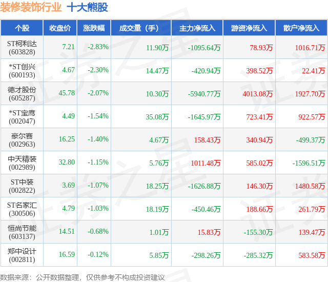 个股表现方面,装修装饰行业当日领跌股为ST柯利达(603828),该股当日报收7.21,下跌2.83%,成交量11.9万,主力资金净流出1095.64万元。*ST创兴(600193)以下跌2.3%紧随其后,该股当日成交量14.47万,主力资金净流出420.94万元。除此之外,德才股份(605287)、*ST宝鹰(002047)、豪尔赛(002963)均进入当日熊股之列。具体个股列表见下表: