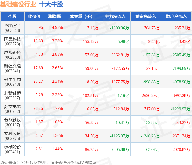 个股表现方面,基础建设行业当日领涨股为*ST正平(603843),该股当日报收5.96,上涨4.93%,成交量17.13万,主力资金净流出1000.06万元。国晟科技(603778)以上涨3.28%紧随其后,该股当日成交量155.12万,主力资金净流出5.9亿元。除此之外,成都路桥(002628)、新疆交建(002941)、冠中生态(300948)均进入当日牛股之列。具体个股列表见下表: