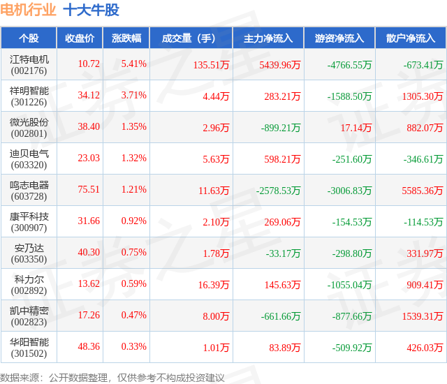 个股表现方面,电机行业当日领涨股为江特电机(002176),该股当日报收10.72,上涨5.41%,成交量135.51万,主力资金净流入5439.96万元。祥明智能(301226)以上涨3.71%紧随其后,该股当日成交量4.44万,主力资金净流入283.21万元。除此之外,微光股份(002801)、迪贝电气(603320)、鸣志电器(603728)均进入当日牛股之列。具体个股列表见下表: