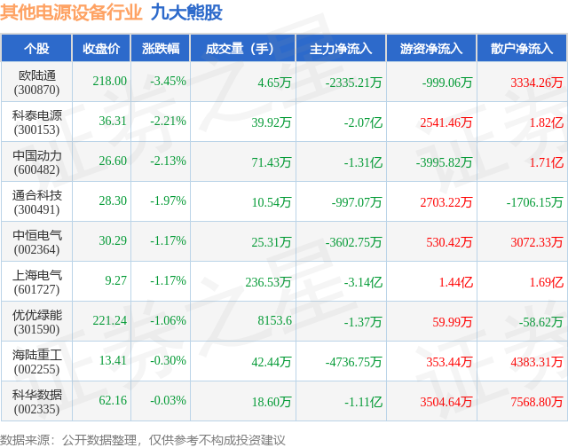 个股表现方面,其他电源设备行业当日领跌股为欧陆通(300870),该股当日报收218.0,下跌3.45%,成交量4.65万,主力资金净流出2335.21万元。科泰电源(300153)以下跌2.21%紧随其后,该股当日成交量39.92万,主力资金净流出2.07亿元。除此之外,中国动力(600482)、通合科技(300491)、中恒电气(002364)均进入当日熊股之列。具体个股列表见下表: