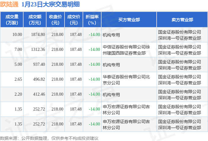 证券之星消息,1月23日欧陆通发生大宗交易,交易数据如下: