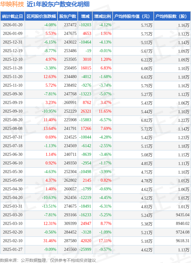 从股价来看,2026年1月9日至2026年1月20日,华映科技区间跌幅为4.08%,在此期间股东户数减少1.02万户,减幅为4.12%。