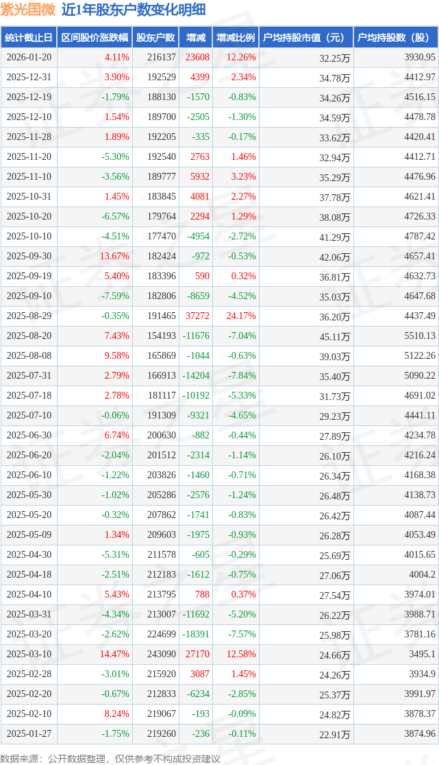 从股价来看,2025年12月31日至2026年1月20日,紫光国微区间涨幅为4.11%,在此期间股东户数增加2.36万户,增幅为12.26%。