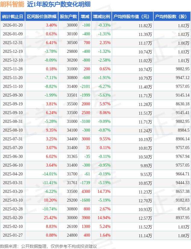 从股价来看,2026年1月9日至2026年1月20日,朗科智能区间涨幅为3.4%,在此期间股东户数减少100.0户,减幅为0.33%。