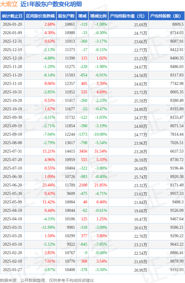 从股价来看,2026年1月9日至2026年1月20日,大宏立区间涨幅为2.68%,在此期间股东户数减少119.0户,减幅为1.08%。